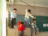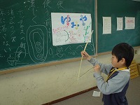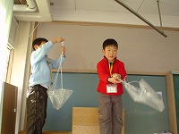 自分でつくったパラシュートは無事飛ぶかな? | こちらは、ゆみや!黒板にまとあてのまとを書いて、高得点を狙います! |