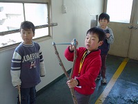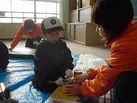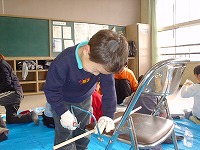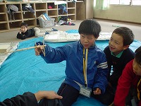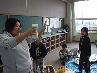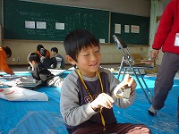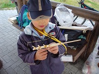 またまたできてしまった!じぶんだけのおもちゃ。子ども達はどんどん改造して、じぶんだけのオリジナルおもちゃを作っていきました。 | こちらは輪ゴム鉄砲の撃ち方jのコツを教えてあげているところ真剣です! | |