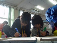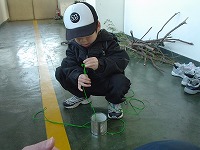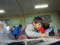 各コーナーにわかれてスタートです! | じぶんが作ってみたいと思ったおもちゃだから、みんな真剣です。こちらは、ビー玉パチンコを作っています。 | 缶ぽっくりをつくっているところ。なかにしかけがあるみたいです。 |