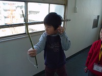 こちらは、どれが一番遠くまでとぶか、武器対決!パチンコか、輪ゴム鉄砲か!はたまた、弓やか!? | みんなの楽しそうな様子をみて、おじさんも参加!おじさんが子どもの頃に遊んだ輪ころがしを教えてくれました。 | |