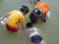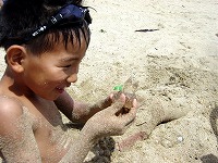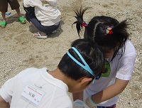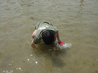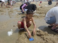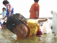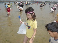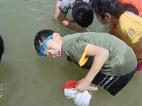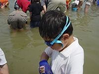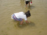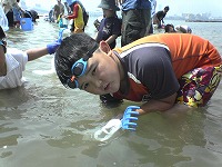 アサリを自分の手で採ると、みんなニコニコ! | 水中めがね装着!真剣です。 |