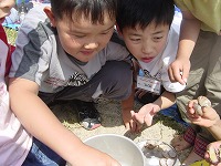 | こちらは、採ったアサリの家作り。でも、砂の上に置くと、生きてるから、10分くらいで、砂の中に潜っちゃうぞ! | 深い所の方が良く採れるよ!本当に、たくさんとっていました! | つめたーい!さむーい!でも続けたーい! |
