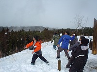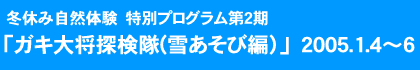 | さぁ、ガキ大将探検隊 雪あそび編スタート!さっそく、パーキングエリア内の展望台であそびます。 | 宿泊先のユースホステルに到着。さぁ、スキーウェアに着替えて、雪あそびに出発! | ガキ大将探検隊は、自分の心の中にある、やってみたいと想うことをとことんやってみる場です。さぁ、みんな、雪ガキを目指すぞ! | ||||||||||
