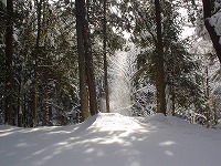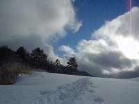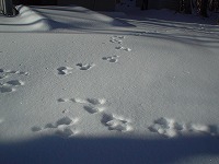 | さぁ、ガキ大将探検隊2日目スタート!今日はとってもいい天気! | 誰の足跡もない、真っ白な雪原が目の前に現れました! | 動物達も陽気に誘われて出てきた様子!これは、うさぎの足跡です。 | ||||||||||