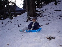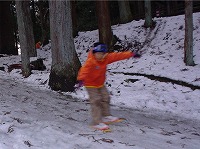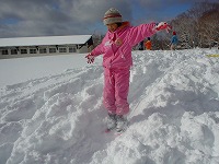 | こちらは<ミニスキー&そり隊>深雪なので、まず、最初に、足でふみながらコースを作ります。 | 昨日は座ってチャレンジでしたが、今日は立って滑ることが出来ました! | 手と足で、バランスをとりながら、上手に滑ります。 | ||||||||||