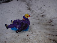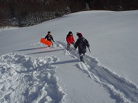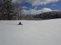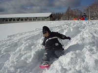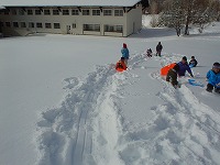 | 深雪なので転んでもぜんぜん、痛くありません! | そり隊は、チームワーク抜群でした。 | どこまで距離をのばせるか!コースに上手くのって、距離はどんどん伸びていきます。 | ||||||||||