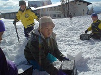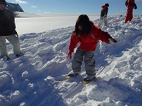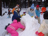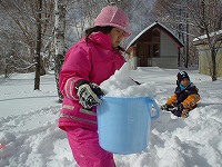 | 今日は、ウォーミングアップ!明日からの「自分がやってみたいこと」を探るために、とにかく雪であそんでみます。かわいい雪だるま。 | 移動中、抑えていた好奇心と、パワーを爆発させて、とにかく元気にあそぶ子ども達。こちらは、しりすべり。 | かまくらを作るために雪を積んでいるところ。 | ||||||||||