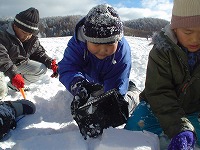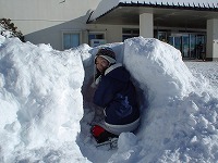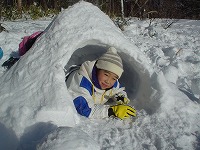 | こちらは、<かまくら隊>まずは、ふかふかの雪をたくさんあつめて、雪山を作ります。 | 山ができたら、ひたすら掘る!掘った雪を中からかきだす!仲間といっしょに共同作業です。 | 出来上がったかまくらに入ってみると、みんな笑顔です。 | ||||||||||