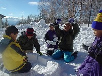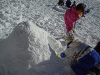 | こちらは、<イグルー隊>雪のブロックをひとつひとつ積み上げていきます。 | 最初は、本当にできるのか、半信半疑のみんなでしたが・・・ | 形ができてくると、嬉しくなってしまうのです。 | ||||||||||