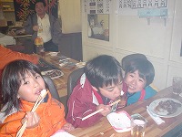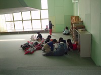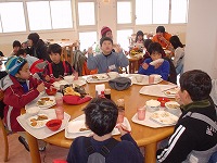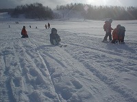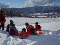 | すわりすべり。スキーをソリ変わりにして滑ります。子どもは何でもあそびにしてしまうのです。 | おひるごはんのようす。たくさん、運動したので、みんな、モリモリ食べます。 | くつをぬいで、ゆっきり休憩です。みんなで、あそんでいるところ。 | ||||||||||