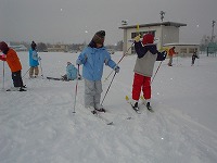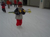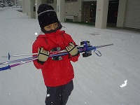 | さぁ、3日目スタート!今日は、パウダースノーのスキーに挑戦だぁ! | 周りの人に当たらないように注意して、自分でスキーをはこびます。 | よーく、準備運動をしたら、早速スキーをはじめます。天候は、あいにくの雪。 | ||||||||||