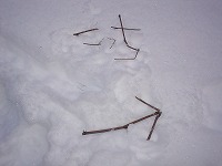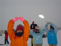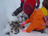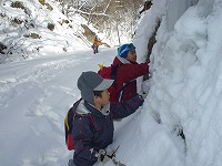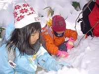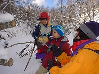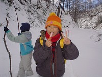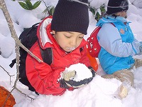 | 道端にある、ツララをみつけたり、森の中で生活する鹿や、ウサギ、リスたちの足跡を追跡していったりしました。 | 深雪にコンデンスミルクをかけているところ。みんな真剣です! | これは、おいしくて大人気でした。 | ||||||||||