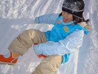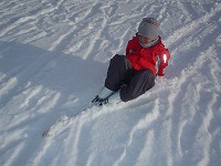 | はじめてスキーをするお友達。まずは、スキーで動き回って、滑る感覚を身に付けます。 | でも、はじめてなので、最初は、やっぱりこけてしまうのです。 | プルークを教えてもらって、どんどん練習です。 | ||||||||||