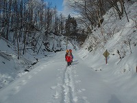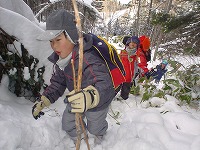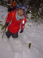 | 小さい学年のお友達も、先頭を歩きます。雪山登山でやる「ラッセル隊」です。先頭は、1年生の隊長! |