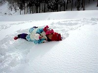 | かまくら完成!3人入れたよ! | 頑張って、たくさん掘りました! | フカフカ雪にダイブ! |