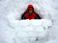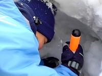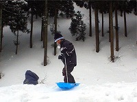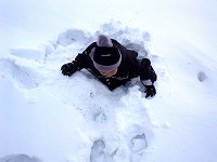 | こちらは、自分の秘密基地つくりをがんばっています。 | 結構中は広くて、深い!地下室タイプの秘密基地でした! | さてこちらは『ソリ&チューブ隊』です。新雪の上を、自分のルートを作って、どんどんすべります。 |