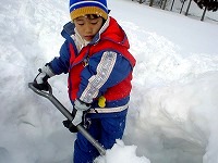 | 今日も、自分の心の奥底に温めていた雪あそびを実現してみます。でも、みんなバラバラではできないので、 | 3つの「似たもの活動チーム」にわかれてやってみたいことをとことんやってみるチャレンジです。せっかくなので、2日間で3回、やってみることにしました。 | さて、こちらは、『イグルー・かまくら隊』+『秘密基地隊』。スコップや、スノーソーを駆使して頑張ります。 |