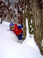 | こちらは、『山の子隊』。夏は道がなく入られない原野「バックカントリー」へ探検です。 | でも、バックカントリーは、そんなに甘くはありません。誰も入らないので、道はないのです。 | 自分達で、雪をかきわけ道を作って、どんどん進まなけらばならないのです。雪こぎはとてもしんどい! |