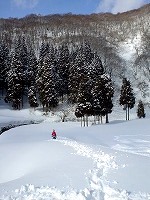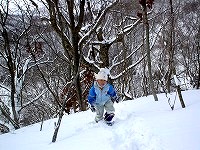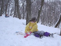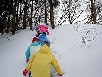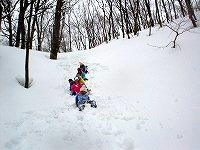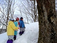 | 大きな木がたくさんあります。何か発見したのかな? | つらら発見! | 登りはしんどくても、帰りはお楽しみの「しりすべり」で帰るので、へっちゃらなのです。 |