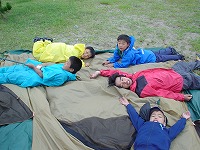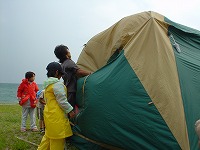 | サボっているのではありません。強風に飛ばされないよう、みんなでテントを押さえているところ。 | スタッフも参戦するくらいの強風!雨もきそうだぞ!! | 風に悪戦苦闘しながらたてている、おとなりのお客さんを横目に、あっという間にたててしまった子ども達!スゴイ集中力!! |