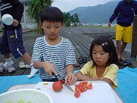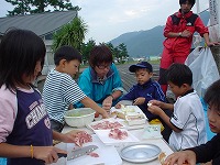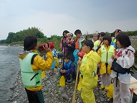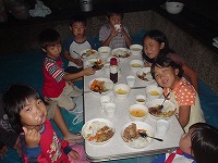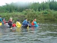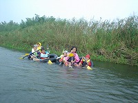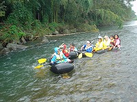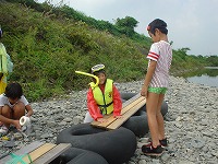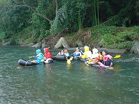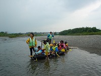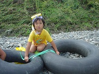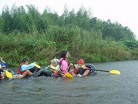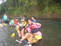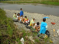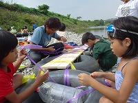 | 最後は、ゆっくり流れてゴールをめざします。 | いかだの目線で見る川は、いつもとなんだか違う自然の風景がありました。 | 生還パーティー!!いかだに乗るまでは、ちょっと緊張したけど、おわってみたら、なんだかホッと、安心した気持ちになり、頑張った自分、頑張った仲間に優しい気持ちになりました。みんなお疲れ様〜。 |