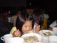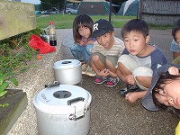 メニュー豚丼、サラダ、ヨーグルトバナナ。 | お米の鍋が沸騰するのをみんなで覗いて待っています。 |