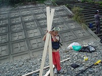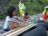 | さぁ、今日は、いかだをつくって、川下りに挑戦!みんな、自分達の作ったいかだが浮かぶか半信半疑?! | 形が決まったら!ひもで結んでいきます。 | |