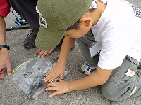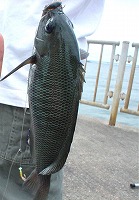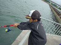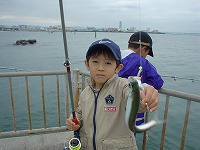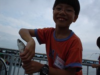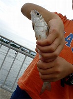 | おっと、最後のほうに、また、大きなのがつれたぞ! | 20cmくらいの鰡です。今日の釣果は、イワシ、アジ、グレ、ボラ、ドンコ(15cmくらい。)。合計100匹以上! | みんな、よく、頑張りました!仕掛けもやって、エサもやって、つりも、針はずしも!全部、できちゃったみんなはすごいね!昼からは、いっぱい釣れて、よかったね!また、色んなことに挑戦してみましょう!(ハギ゙) |