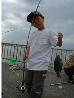 | 釣れるは、釣れるはで、その上、こんな大きなグレまで釣り上げました!すごいぞ! | 20cm位のグレ。とてもおいしい釣り人に人気のある魚。釣り人のおじさんたちも、これには拍手喝采! | 釣り上げたイワシもグレも、子ども達にとっては、自分でやった証。とっても大事な宝物です。 |