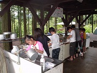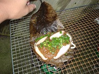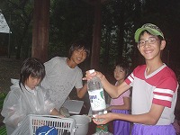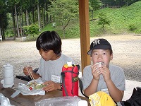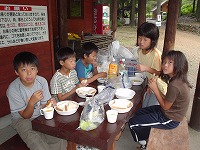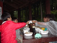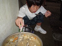 | 焼いたちちこににんまりです。お味は・・・。とってもおいしかったので、午後からもちちこを捕ることになりました。 | 夕食は食事当番が作ります。今夜のメニューは、すいとん、ほうばみそ、ご飯です。 | すいとんが初めての子ども達は、もち入り味噌汁と勘違いしています。お味はどうですか・・・? | ||||||||||