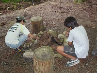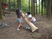| テントの立て方、ペグのうち方、知らないことはスタッフが教えてくれますが、トライするのは自分達です。 | こちらは、班のかまどをつくっているところ。 | こちらの女の子達は、自分達の椅子にするための、丸太を運んでいます。たくましい! | ||||||||||