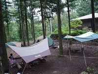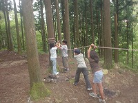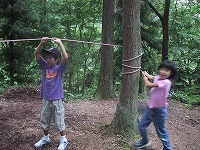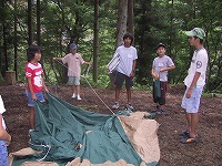 | 洗濯ロープを設置します。いっせいに引っ張って、ピンとはるぞ! | こっちもひっぱってよぉ〜 | 出来上がったガキ大将村。さぁ、5日間の始まりです。 | ||||||||||