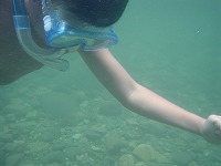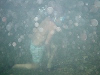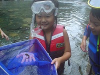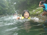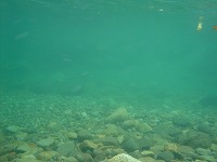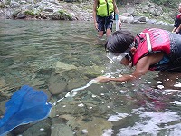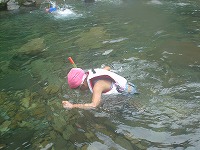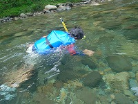 | 水の中!見えにくいですが、きらきらと小さなあまごの稚魚が沢山泳いでいました。 | こちらは、スタッフとバディ(二人組みになって)をくんで、すもぐりに挑戦!魚を追い求めて、水中を移動中。 | キャンプ場前にこんなに素敵な沢があります。 | ||||||||||