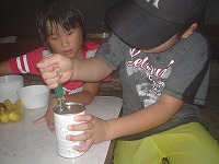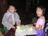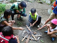 | 川で遊んだ後は、自分達で、夕食作り。やりたいという気持ちが一杯の子ども達は、1時間でよるご飯を作ってしまいました。 | 大人気のほうちょう!やる順番をみんなで決めていました。 | |||||||||||