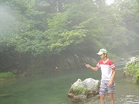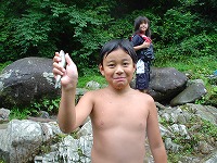 | やりました!泳ぎながら、しかも、素手で自然の鮎をつかみました!すごい!!執念! | もちろん、おいしく塩焼きでいただきますで遊んおいしく塩焼きにしておいしく頂きました。 | こちらは、体を冷やさず、魚を捕まえる方法!? | ||||||||||
