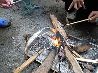 | でも、岸から離れすぎると、自分達で漕いでもどらなくてはなりません。 | 朝から自分達で捕ったちちこ(よしのぼり)を焼いて食べてみます。 | 体調7〜8aのちちこを串にさして、遠火でじっくり焼き上げます。 | ||||||||||