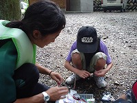| おはようございます。雨もやんでます!今日は何してあそぼうか? | 朝のミーティングで、今日一日何をしたいかみんなで決めます。今日は、川釣りチームと、魚捕り&川遊びチームに分かれます。 | こちらは、川釣りチーム。しかけを自分でつけているところ。もちろん、えさも自分で探さなくてはなりません。 | ||||||||||