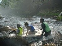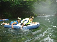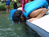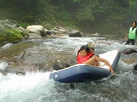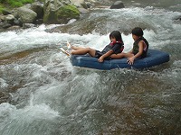 | 昼からは、ラフティングボート改め、ラフティングベッドで川下りに挑戦! | バランスが必要です。かっこよく映ってますが、この後あえなく撃沈! | さぁ、バランスを保ちながら、流れにのって進め!進め! | ||||||||||