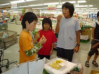 試食コーナーの郡上八幡名物のとうもろこしをパクリ! | お金がたりるかはらはらドキドキです。 |