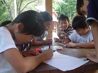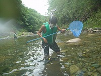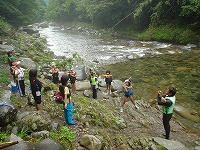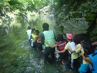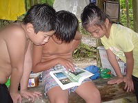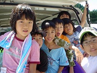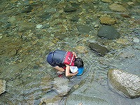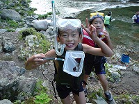| つかまえた、魚の種類を図鑑で調べています。「載ってないぞ」「新種かなぁ〜」 | 日中は、夏らしい晴れ間がのぞき、思いっきり川遊びが出来ました。 | ▲TOP | ||||||||||