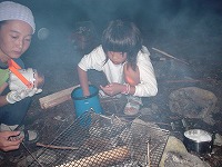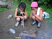 | 初日は、何をしてよいか戸惑う場面もありましたが、今日は、それぞれがそれぞれの遊びを楽しんでいました。 | 執念実り、ドンコをゲット!喜びは人一倍です! | たき火の火が小さくなったら、火吹き棒!?(シュノーケル)で火を吹きます。 | ||||||||||