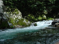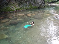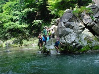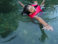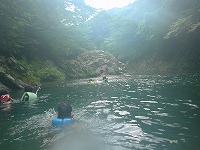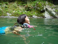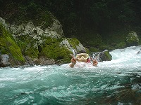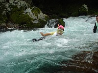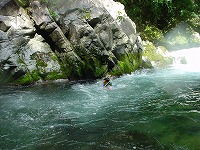 | 岩場から、こんどは、対岸へダイビング!ダイビングの後は、自分で泳がないと、そのまま下流へ流されてしまいます。 | これが、"人間ウォータースライダー”白くなっている、早い流れにのって、一気に川を下ります。 | 慎重に、スタート地点へ移動。みんなドキドキ、少し緊張気味です。 | ||||||||||