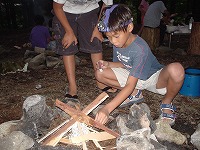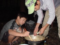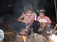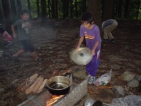 | 今日が、最後の夜です。パーティー準備開始! | 薪で火をおこし、それぞれの班のパーティーメニューを作ります。 | 火がおきないと、料理が作れないぞぉ〜! | ||||||||||