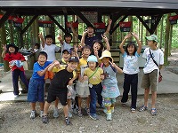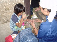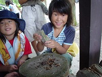 | こちらは、裏山で見つけた、クルミの実を食べているところ。 | 出発の時間まで、子ども達の遊びはつづきました。 | |||||||||||